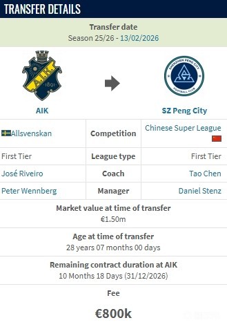德转显示,克罗地亚后卫本科维奇从AIK索尔纳加盟深圳新鹏城的转会费为80万欧。