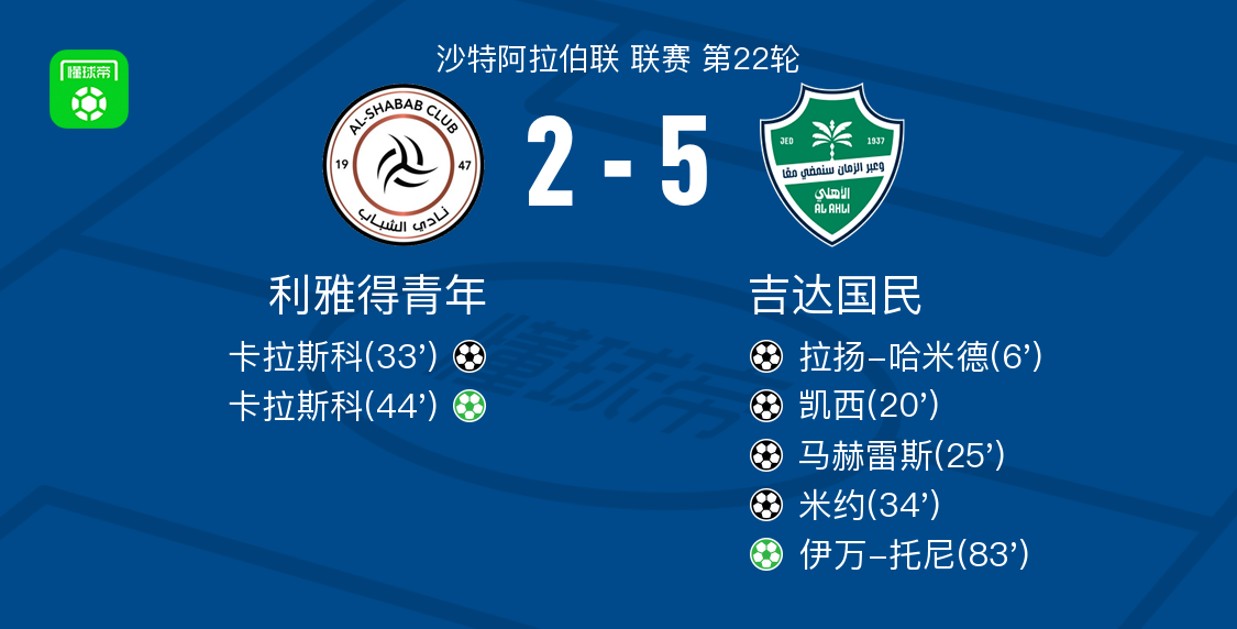 北京时间2月13日沙特阿拉伯联 联赛 第22轮,利雅得青年主场对阵吉达国民。利雅得青年卡拉斯科梅开二度。吉达国民拉扬-哈米德破门,凯西破门,马赫雷斯破门,米约破门,伊万-托尼破门。最终比分利雅得青年 2-5 吉达国民。