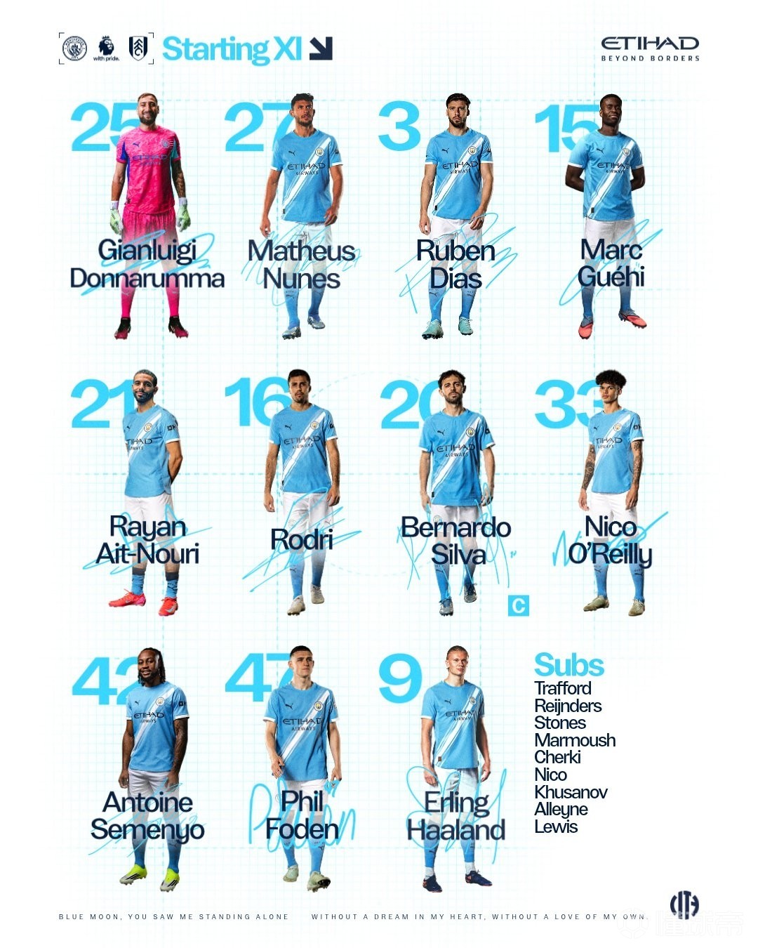 曼城首发:25-多纳鲁马、27-马特乌斯-努内斯、3-鲁本-迪亚斯、15-格伊、21-艾特-努里、16-罗德里、20-伯纳多-席尔瓦、33-尼科-奥赖利、42-塞门约、47-福登、9-哈兰德