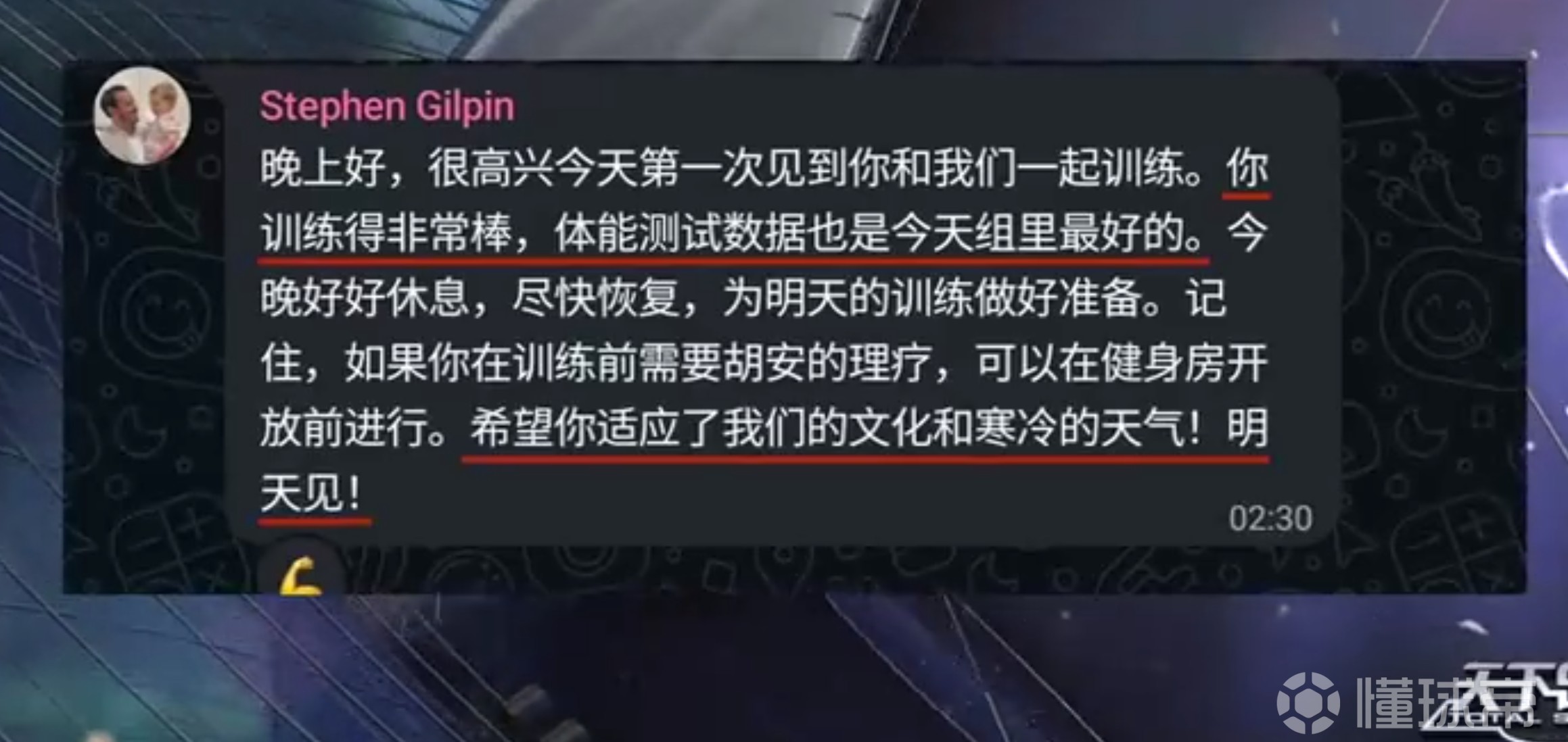 在纪录片中,还有一个温馨的小细节颇为令人感动,在徐彬完成体能测试后,狼队运动表现副主管史蒂芬特意将体测结果以及建议翻译为简体中文,发给徐彬,并对他的表现给予了肯定与鼓励。