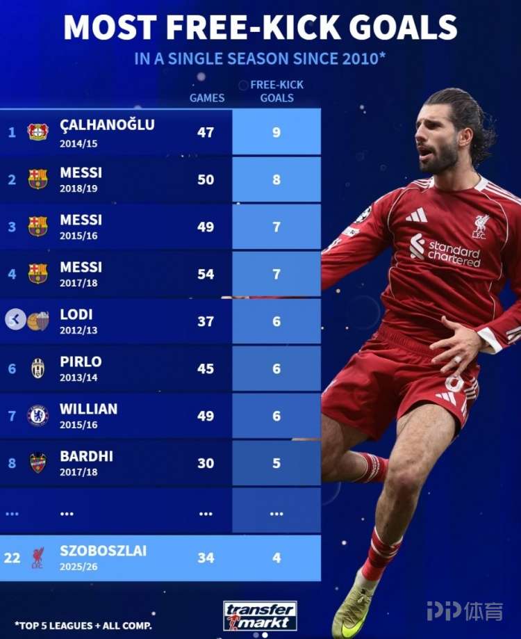 利物浦在本轮英超1-2被曼城逆转,索博斯洛伊打进直接任意球,本赛季已4进任意球。数据统计显示,他也能在2010年后的五大联赛球员单赛季各项赛事任意球进球榜位列第22位。