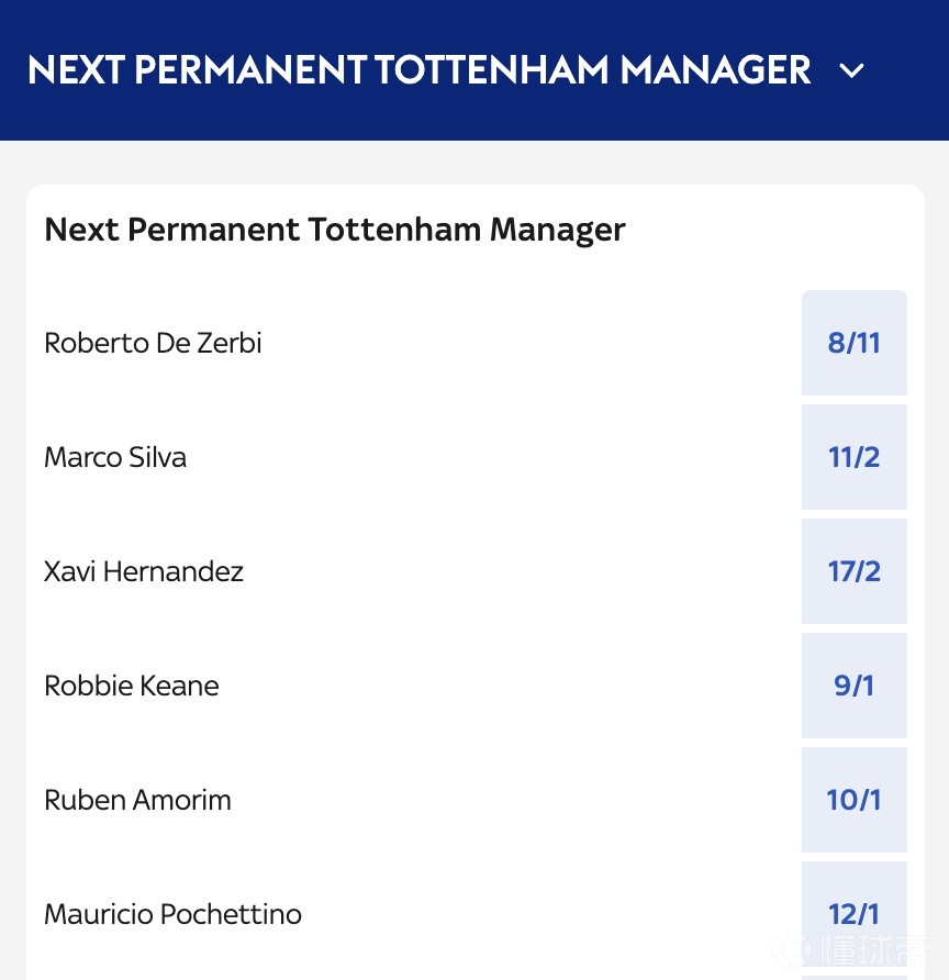 北京时间2月11日,在托特纳姆热刺解雇原主帅托马斯-弗兰克之后,Squawka的统计指出,前马赛主帅德泽尔比是目前赔率最低的接替者。