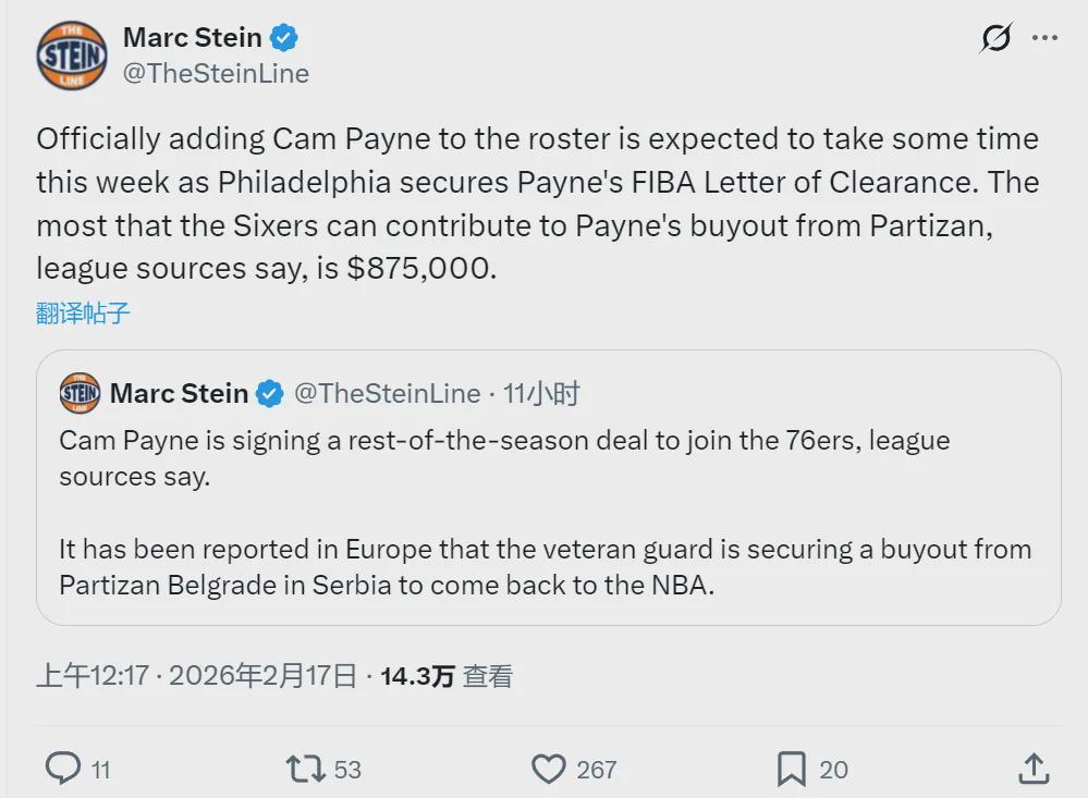 Shams:前马刺前锋索汉将在买断澄清期结束后加盟尼克斯