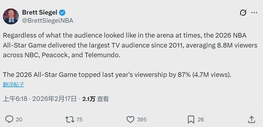 官方:2026NBA全明星赛收视率创2011年以来新高,比去年高87%